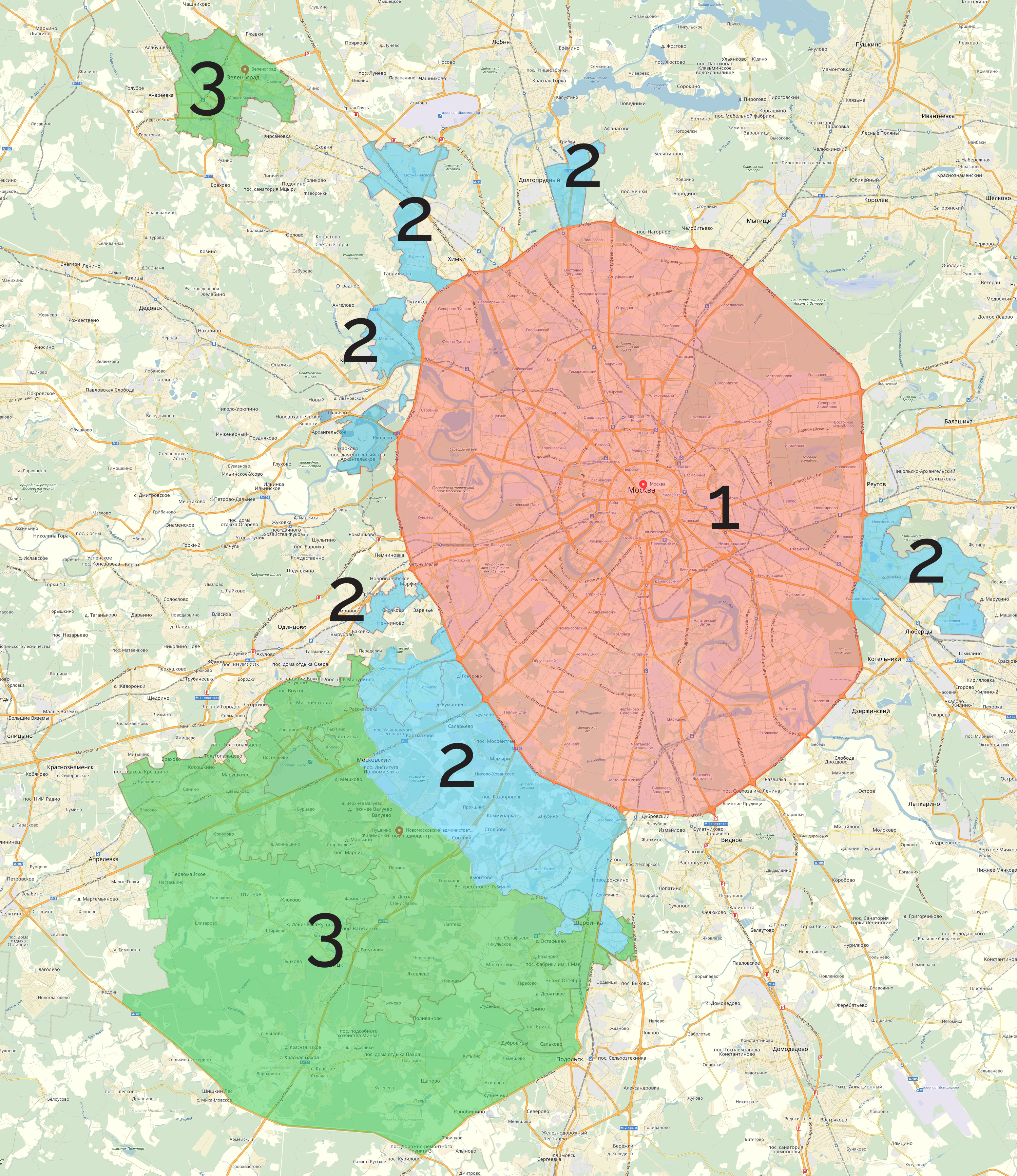 Зона №3 — см. зеленый цвет — Москва, за пределами МКАД, свыше 10 км, но не далее трассы А-107 (Московского малого кольца); Зеленоград: